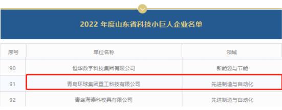 日前,在省科技廳指導(dǎo)下,山東省科學(xué)院情報(bào)研究所、山東省創(chuàng)新發(fā)展研究院聯(lián)合向社會(huì)發(fā)布 2022 年度山東省科技領(lǐng)軍企業(yè)和首批科技小巨人企業(yè)名單。青島環(huán)球重工科技有限公司入選山東省首批科技小巨人企業(yè)名單。