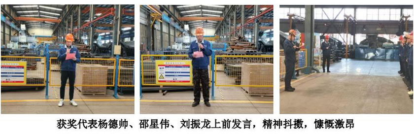 獲獎(jiǎng)代表?xiàng)畹聨?、邵星偉、劉振龍上前發(fā)言,精神抖擻,慷慨激昂 劉總首先向獲獎(jiǎng)員工表示祝賀,號(hào)召全體員工向獲獎(jiǎng)人員學(xué)習(xí),以先進(jìn)為榜樣。劉總總結(jié)大干的數(shù)據(jù)成果及收效,在項(xiàng)目履約率、設(shè)備加工效率、機(jī)器人焊接及模具裝配等方面刷新了紀(jì)錄,實(shí)現(xiàn)了新突破。劉總強(qiáng)調(diào)“大干 60 天”的生產(chǎn)目標(biāo)圓滿完成,離不開中層領(lǐng)導(dǎo)干部的努力拼搏,更離不開技術(shù)團(tuán)隊(duì)、一線生產(chǎn)團(tuán)隊(duì)朝出暮歸、不辭勞苦的辛勤付出。