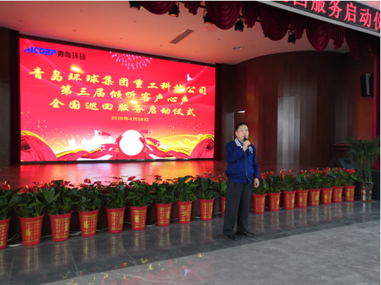 孟夏之日,萬物并秀。4月28日,青島環(huán)球集團(tuán)重工科技公司2020年“傾聽客戶心聲,全國巡回服務(wù)”啟動(dòng)儀式在集團(tuán)總部多功能廳舉行。青島環(huán)球集團(tuán)重工科技公司總經(jīng)理及各部門負(fù)責(zé)人、車間主任、班組長、服務(wù)工程師代表等100余人匯聚一堂,共同見證環(huán)球重工品牌魅力與匠心服務(wù)的楊帆啟航。