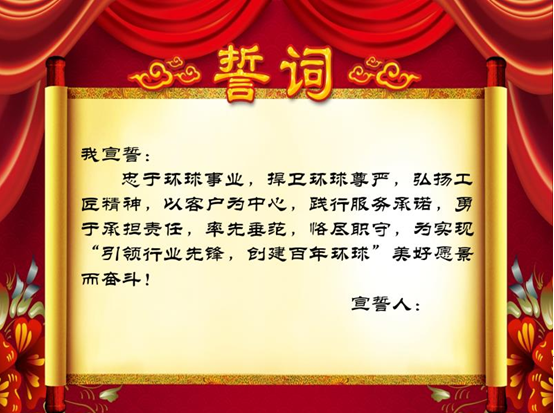 啟動(dòng)儀式上,服務(wù)工程師團(tuán)隊(duì)莊重宣誓:忠于環(huán)球事業(yè),捍衛(wèi)環(huán)球尊嚴(yán),弘揚(yáng)工匠精神,以客戶為中心,踐行服務(wù)承諾,勇于承擔(dān)責(zé)任,率先垂范,恪盡職守,為實(shí)現(xiàn)“引領(lǐng)行業(yè)先鋒,創(chuàng)建百年環(huán)球”美好愿景而奮斗!