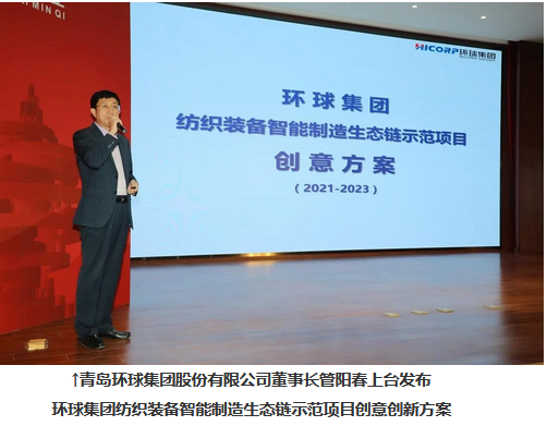 作為東道主的青島環(huán)球集團董事長管陽春上臺發(fā)布了“紡織裝備智能制造生態(tài)鏈示范項目創(chuàng)意方案”。管陽春董事長從規(guī)模、市場、研發(fā)、品牌、行業(yè)引領、行業(yè)示范七個方面介紹了環(huán)球集團的主要優(yōu)勢,深度剖析了紡織行業(yè)目前的痛點,重點提出了“環(huán)球智工廠”解決方案。并對環(huán)球的發(fā)展規(guī)劃、發(fā)展訴求以及“環(huán)球智工廠”的品牌建設進行匯報,希望能在政府及各位專家的支持下、在擁有“爭先鋒”基因的環(huán)球人的努力下,實現(xiàn)環(huán)球人的初心和使命——“讓環(huán)球員工、股東生活得更有尊嚴,讓中國制造贏得世界尊重”。